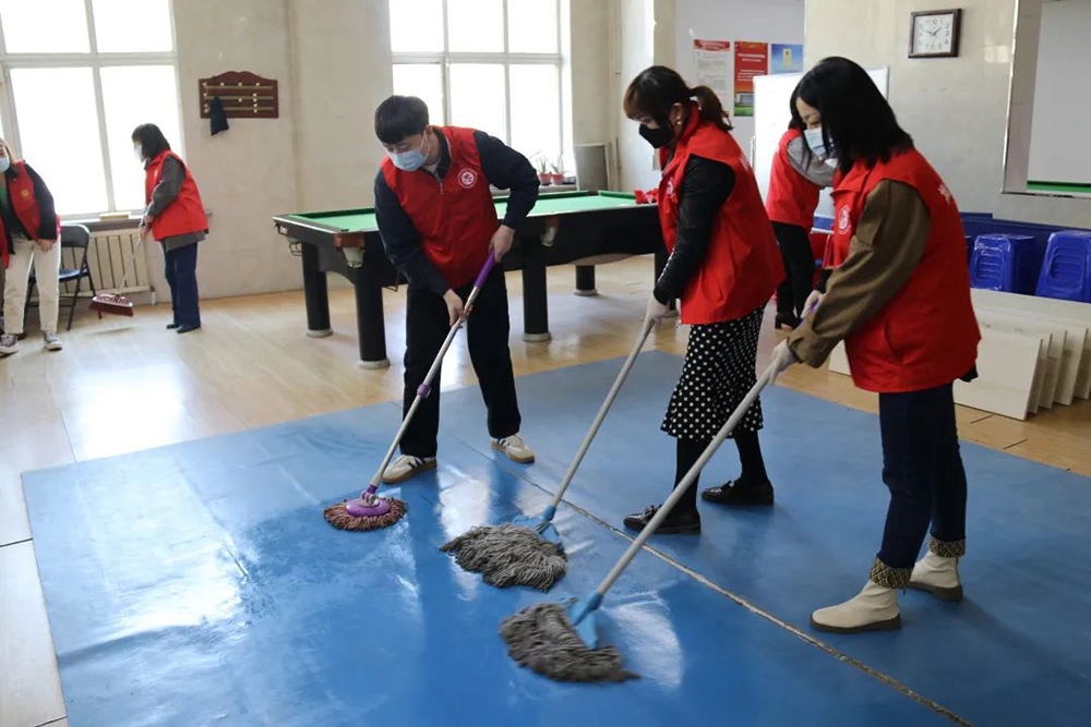 此次活動圍繞清掃社區(qū)居民活動室展開。下午1點30分,航空集團25名黨員及入黨積極分子準時到達美地社區(qū),大家迅速穿上醒目的志愿者紅馬甲,分工合作起來?;顒蝇F(xiàn)場,志愿者們積極投入到清掃社區(qū)活動室地面、清除衛(wèi)生死角、擦拭公共展板等工作中。此外黨員志愿者們在社區(qū)工作人員的帶領下,搬桌子、掛條幅、擺凳子,圓滿完成美地社區(qū)即將召開黨員大會的前期布置工作。