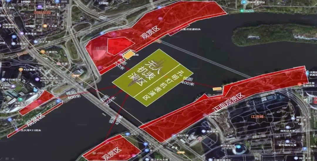 無人機表演位置位于盛京大劇院南側(cè)河面上空,渾河兩岸均可觀賞。根據(jù)無人機空中圖像位置和高度,建議觀賞區(qū)域如下:1. 渾河南岸由渾河大橋以東至南洋碼頭區(qū)間;2. 渾河北岸由渾河大橋以東至秦開像南面的觀景臺區(qū)間;3. 渾河大橋以西南北兩岸距渾河大橋500米以內(nèi)區(qū)間。
