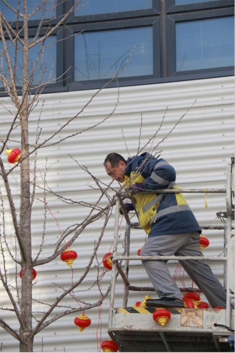 為給園區(qū)營造濃厚的節(jié)日氣氛,給入駐企業(yè)帶來如家般的溫情呵護,沈陽航發(fā)展運營管理有限公司物業(yè)團隊,在零下二十度的氣溫下,凍紅了雙手,冰覆了睫毛,但他們依然堅守,扶梯的扶梯、攀爬的攀爬,將火紅的燈籠掛在園區(qū)主干道、企業(yè)門前。滿街的火紅,是他們對園區(qū)的熱愛,也是對工作的執(zhí)著,更是對崗位責任的滿滿執(zhí)念。園區(qū)的燈亮了,客戶們洋溢的笑臉,映襯著角落里一道道靚麗的風景線,夜幕降臨下,五彩斑斕的彩色燈光給園區(qū)增添了不少喜慶的色彩,也深深的印在了師傅們熱切的心里。